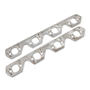 Small Block Ford big tube wide rectangular shaped port header adapter exhaust flanges. These flanges come as a pair and are designed for 2" horizontal centerline bolt pattern SBF heads, machine work included. Includes (8) countersunk holes for bolting 3/8" diameter flat head bolts to head and (8) 3/8"-16 tapped holes to locate SBF flanges with larger port sizes for 1-7/8" or 2" diameter primaries. SBF header flanges not included, laser-cut from heavy-duty 3/8" thick carbon steel for superior resistance to warping from high heat, recommended header flanges are HFSBFTFHP188 or HFSBFTFHP200, or any other 3/8" thick Small Block Ford header flange with 2-3/4" width diagonal header bolt pattern.