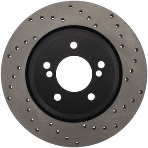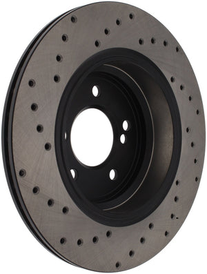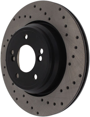 StopTech Drilled Sport Rotors are 1-piece direct replacement brake discs for factory brake systems and stock calipers that look great behind your wheels – and offer significantly improved braking performance. The unique cross-drilling aids with heat and brake dust dispersal, prevents glazing of the pads, adds bite and improves wet and dry braking performance. Built to last, the black e-coating provides protection from corrosion and the high carbon metallurgy (in most applications) offers quieter operation, better crack resistance and increased performance.