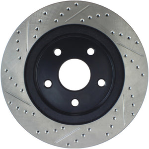 StopTech Drilled and Slotted Sport Rotors are 1-piece direct replacement brake discs for factory brake systems and stock calipers that look great behind your wheels – and offer significantly improved braking performance. The unique cross-drilling and slotting aids with heat and brake dust dispersal; prevents glazing of the pads; adds bite and improves wet and dry braking performance. Built to last; the black e-coating provides protection from corrosion and the high carbon metallurgy (in most applications) offers quieter operation; better crack resistance and increased performance. Warranty