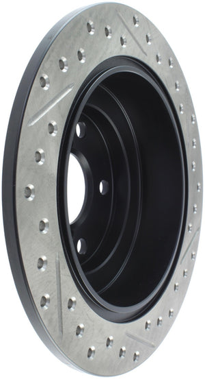 StopTech Drilled and Slotted Sport Rotors are 1-piece direct replacement brake discs for factory brake systems and stock calipers that look great behind your wheels – and offer significantly improved braking performance. The unique cross-drilling and slotting aids with heat and brake dust dispersal, prevents glazing of the pads, adds bite and improves wet and dry braking performance. Built to last, the black e-coating provides protection from corrosion and the high carbon metallurgy (in most applications) offers quieter operation, better crack resistance and increased performance.