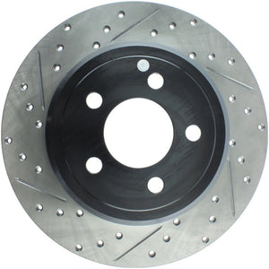 StopTech Drilled and Slotted Sport Rotors are 1-piece direct replacement brake discs for factory brake systems and stock calipers that look great behind your wheels – and offer significantly improved braking performance. The unique cross-drilling and slotting aids with heat and brake dust dispersal; prevents glazing of the pads; adds bite and improves wet and dry braking performance. Built to last; the black e-coating provides protection from corrosion and the high carbon metallurgy (in most applications) offers quieter operation; better crack resistance and increased performance. Warranty