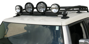This stylish and functional light bar assembly mounts to the OEM factory roof rack on an FJ Cruiser. Is designed to accept four large lighting systems or six 4 inch lighting systems. A protective tray conceals and routes the wiring harnesses. Constructed using powder coated 1/8 inch thick steel. Lights not included. Installation Instructions