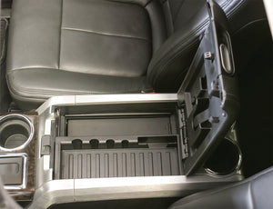 Continuing the Tuffy legacy of designing and manufacturing the finest console safes in the industry since 1997, Tuffy is proud to introduce our new line-up of console safes for full size trucks beginning with the Ford F-150 flow-through center console safe. It maintains a completely stock look including full use of the factory accessory tray, armrest and lid. Featuring a durable texture powder coat finish, the safe comes ready to install in just a few minutes without drilling. Installation Instructions