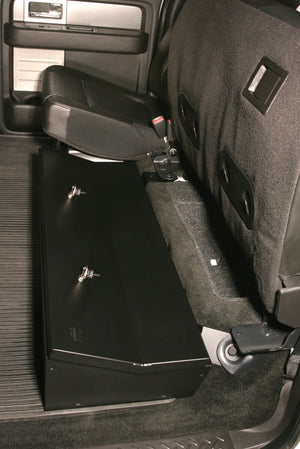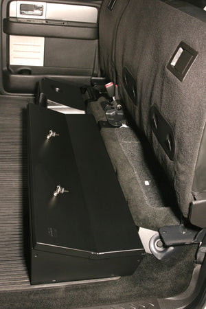 This high security welded steel lockbox mounts under the rear seat (Driver side) in your 2009-2014 Ford F-150 Crew Cab with the subwoofer. The formfitting design of the Tuffy lockbox has over 2740 cubic inches of lockable storage. Its secured contents are easily accessed by flipping the rear seat up. The innovative mounting system only accessed from inside the box when unlocked allows the entire lockbox to be removed in seconds, without the need for any tools, when extra floor space is needed or to store the lockbox and locked contents in an alternate location. Featuring Tuffy's Pry-Guard Locking System with a 10 tumbler double bitted security lock with built in weather seals. Mounts inconspicuously under the seat out of apparent site of opportunistic thieves. Is quickly and easily installed using the factory hardware without drilling. Installation Instructions