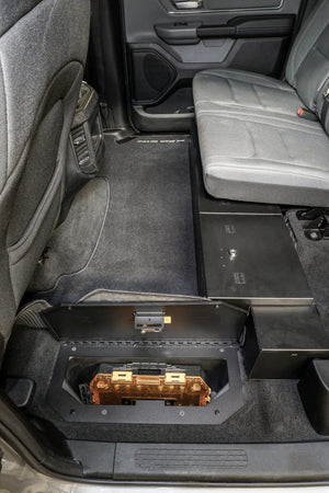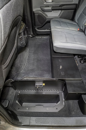 Sometimes you temporarily need to store your firearm in your truck, these heavy-duty locking Storage Lids replace the existing plastic OEM factory covers, creating secure storage in the hidden OEM compartments in the floor. The unique designs feature our Pry-Guard locking system with 1/8 inch thick steel components and a welded continuous steel hinge. The lids also provide a sturdier and more durable deck surface for items placed on top. Easy to install using standard hand tools in just a few minutes. Constructed from 16 gauge and 1/8 inch thick welded steel. Installation Instructions