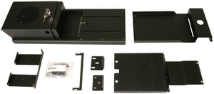 This 16 gauge steel overhead security console has one lockable compartment for mounting a stereo, CB Radio, speaker or other electronic device. The compartment door swings up flush and latches open. The door is secured shut by a double bitted 10 tumbler lock with built in weather seals. A bolt in stereo mounting bracket makes installing a DIN mount stereo or CB radio a breeze. The innovative sliding design allows access to the levers for removing the Jeep factory tops. Installation Instructions