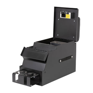 This convenient 10 inch wide, 16 gauge steel security console features Tuffy’s patented pushbutton latch system. For safety and convenience while operating the vehicle, the lid also latches closed without having to be locked. It has 2 compartments, a separate compartment for mounting a stereo, CB Radio, or other electronic equipment, and a lockable rear storage space lined with a rubber floor mat. The spacious rear compartment accommodates a CD changer, tools, and other valuables.