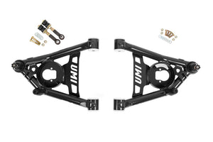 Tired of looking at hammered, crusty lower a-arms with cracked ball joint bosses? UMI has the solution with brand new modern tubular lower a-arms. UMI lower A-Arms are fabricated from DOM tubing with CNC machined tube ends for a precision fit. They are jig built to maintain accuracy and bolt on correctly every time. All critical areas are TIG welded for superior strength and a clean look. UMI's lower A-Arms also feature improved ball joint angle for lowered vehicles and the design provides additional tire clearance. Our P/N 4032 lower a-arms include greaseable, UMI designed and manufactured Delrin bushings. Delrin bushings offer supremely smooth suspension action and precision operation while still providing some insulation from road noise. They come preloaded with polyurethane bump stops, polyurethane spring isolators and premium ball joints. UMI's extensive testing on the street, drag strip and skid pad ensures a quality product able to with stand all types of abuse. UMI lower A-Arms are designed to work with factory springs, lowering springs and coil over kits without changing the a-arms. For exceptional handling and performance we recommend combining with UMI upper a-arms, part # 4033-1. UMI Performance lower a-arms are shipped fully assembled and ready for installation. Designed and manufactured with pride in Philipsburg, PA - USA.
