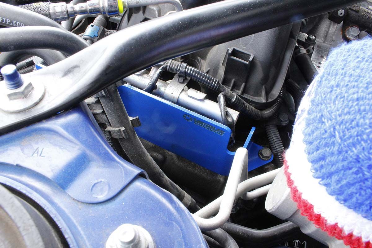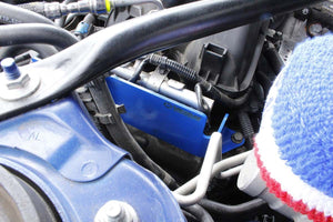 Shed weight from the engine bay by removing the factory bulky steel piece and installing our lighter stainless steel brackets.  These are powder coated in three popular colors to add some color to the engine bay as well.