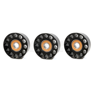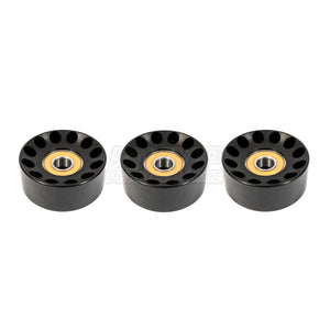 Included in this kit are 3 of our 90mm idlers, which are a direct replacement for the factory 90mm idlers. When using this kit you replace the factory stamped steel idlers with robust billet aluminum idlers that aren't prone to cracking/exploding like the factory idlers are. When replacing the factory 90mm idlers with our 90mm idlers there is no change in necessary belt length.