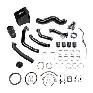This big single turbocharger install kit from WCFab for 2001-2004 Chevy Silverado 2500 / 3500 HD trucks contains what you need to swap from your stock IHI style turbo to a larger frame Borg Warner S400 style setup on a 6.6L LB7 Duramax diesel engine. Upgrades your existing air cleaner setup to a larger 5" fabricated aluminum intake with heavy duty sheet metal air box and high performance dry filter with pre-filter cover. Intercooler hot and cold side charge pipe plumbing are also updated to high flow 3" diameter mandrel bent 14 gauge aluminum tubes. Includes our upgraded high flow 3" fabricated billet y-bridge kit which replaces the restrictive stock upper intake manifold to finish off the air flow path into the engine and allow for maximum horsepower and efficiency gains. Supplied Oil Lines are high-quality stainless steel braided Parker Lines with the oil feed line routing from the main oil galley on the side of the engine block. A variety of popular turbo size options (sold separately) mount to a T4 fabricated steel pedestal with spacer which is compatible with our 2" high flow stainless steel up pipes.  Included high temp ceramic coated turbo downpipe connects to your existing exhaust front pipe V-Band clamp. This simplifies installation and requires NO cutting or modification to your exhaust system. If you are not purchasing a genuine Borg Warner turbo from us, you must specify the brand and details of what you are using so that our sales team can assist you with placing your order and ensure proper fitment. You may be required to ship a separately supplied turbo to us in advance for mock-up to build your kit. Your order lead time starts when we have the turbo needed to build your kit our possession. Includes Driver Side Transmission Dipstick Tube, making installing the down pipe easier.