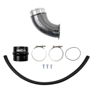 The WCFab LB7 4 in. High Flow Cast Aluminum Turbo Intake Horn for 2001-2004 Chevrolet Silverado or GMC 2500 / 3500 HD trucks equipped with the 6.6L Duramax Diesel is the largest and highest flowing turbo inlet on the market. Replaces the restrictive OEM turbo mouthpiece to provide increased airflow to your turbocharger for improved engine performance and throttle response. Compatible with factory IHI Turbo or upgraded drop in IHI Turbos and aftermarket intakes. Great upgrade offering quicker spool up and more HP! Max-effort tuned trucks can see 10-15 HP gains while applications with upgraded turbochargers can experience as much as 20 HP improvements. Custom powder coated in the color of your choice. Made in USA! Pair it with our 4" Cold Air Intake Kits and Stage 1 High Flow Bundle Kits along with custom performance tuning and drop in performance turbochargers for maximum performance gains. - - NOT COMPATIBLE WITH OEM INTAKE - - Fitment Note: Works with performance aftermarket intake systems utilizing a 4" Boot Connection with bead roll, like our 4" Intake Kits. Will your 3rd party intake be compatible? If the rubber / silicone connection of your current air intake is molded into the intake pipe / is not removable, that intake will not work / fit with this product. - - Supersedes WCF100342