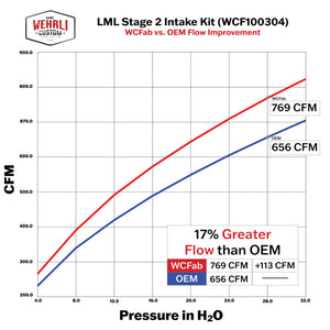 WCFab 2011-2016 LML 6.6L Duramax Stage 2 Intake Kit with Air Box. This high flow, fabricated aluminum intake pipe and air box enclosure with dry filter assembly replaces the restrictive plastic factory parts on your diesel for improved engine performance. All new design significantly increases air flow to your turbo producing improved horsepower and torque, quicker throttle response, and cooler intake temperatures by drawing cold air through the inner fender. All aluminum construction features large diameter 4" piping with smooth aerodynamic bends to improve intake air velocity, volume, and provide more aggressive engine and turbo sound during acceleration. High quality hardware, silicone boot, seals, and stainless steel t-bolt clamps ensure optimum durability and ease of installation. Removable air box lid elementallows for easy visual inspection and maintenance of your WCFab filter with included hydrophobic pre-filter cover, to help keep your MAF sensor, turbo, and engine airways contaminant free. - - Includes High Flow 4.8 in. Cast Aluminum Turbo Intake Horn which removes restrictions in the OEM setup to improve turbo spool and top end power and eliminates factory resonator for improved appearance and more aggresive turbo sound. This High Flow 4.8 in. horn is fully compatible with OEM and upgraded drop in VGT style turbochargers. Full assembly finished in your choice of WCFab's signature custom powder coat colors for a look as unique as your truck. Not compatible with aftermarket LML Y-bridges that change the manifold / bridge inlet from original factory (driver side inlet) location. - - NOTE: 2011 MODEL YEAR TRUCKS MUST UPDATE PCV Regulating Valve to 2012-2016 model year spec to allow correct fitment and compatibility with this part.