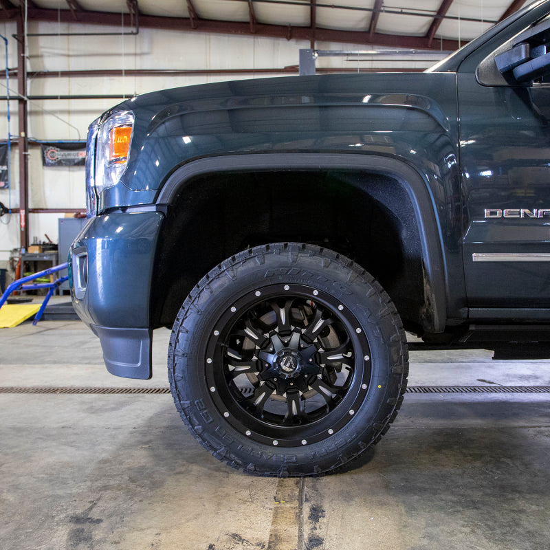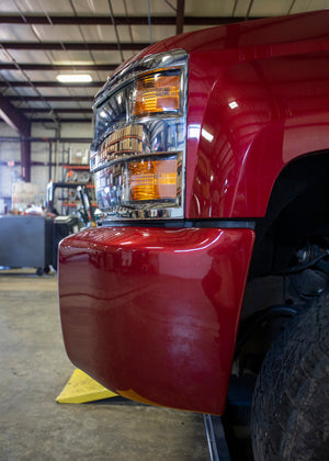 2015-2019 Silverado and Sierra 2500HD / 3500HD CNC machined billet aluminum spacer kits from WCFab move the front bumper forward, keeping it off the frame horns 3/8 of an inch while maintaining the maximum mounting surface area for structural integrity. Moving the bumper forward allows for the fitment of wider and taller wheel and tire combinations with a more negative offset. It prevents or reduces the need for additional trimming of OEM components. - - Finished in a Flat Black powder coat for additional corrosion resistance and OEM-like appearance. - - Installs easily with basic hand tools. - - For more aggressive fitments, please see our 3/4" Spacer Kit part number WCF100462